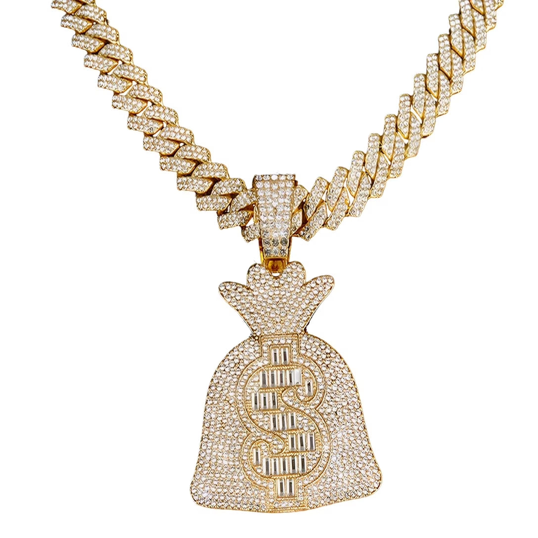 men’s gold cz money bag necklace, us dollar bag necklace, rhinestone dollar sign cuban necklace, iced out dollar money bag cuban necklace, hip hop dollar symbol pendant, lucky money bag cuban necklace, rapper money bag cuban necklace rich dollar sign jewelry, rock dollar sign jewelry
